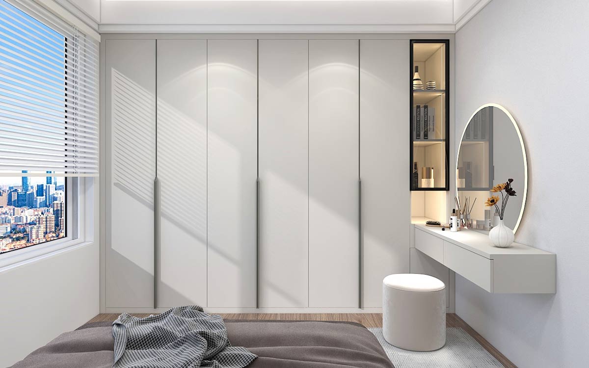 When wardrobes take up a lot of space in a room, go for white wardrobes. Furthermore, this hue will reflect light, making the space look larger.