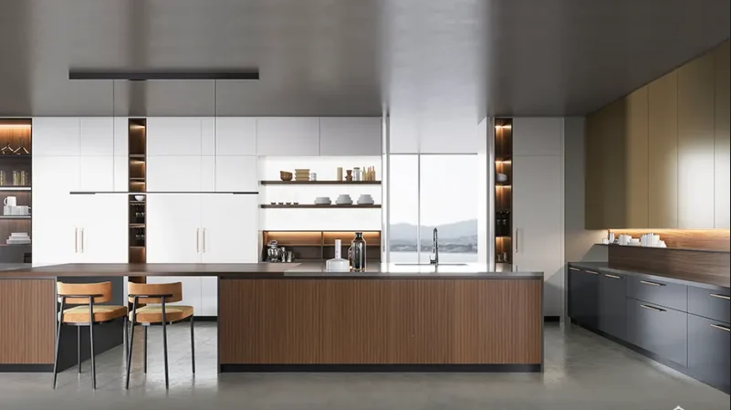 Frameless cabinets, also known as European-style cabinets, are a more modern cabinet construction style. Instead of a frame, the cabinet box is constructed with thicker side walls supporting the doors and drawers. This cabinet style is popular in contemporary and minimalist kitchens, as it offers a sleek and streamlined look. Frameless cabinets are typically made from plywood or MDF with a laminate or veneer finish.