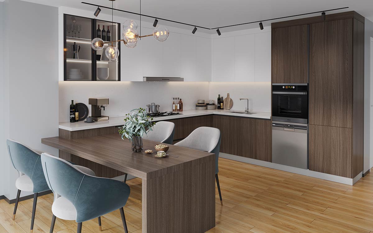 L-shaped kitchen: In this layout, cabinets, and appliances are arranged in an L-shape, with countertops on two adjoining walls. It is a versatile layout that can work in small or large kitchens.